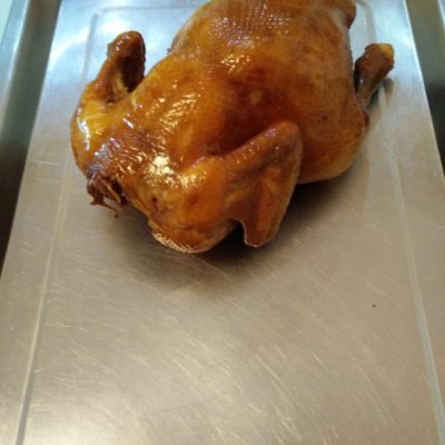 Poulet entier mariné et laqué à feu doux au soja (saveur sucrée). Le laquage permet d’avoir une viande extrêmement juteuse et tendre.